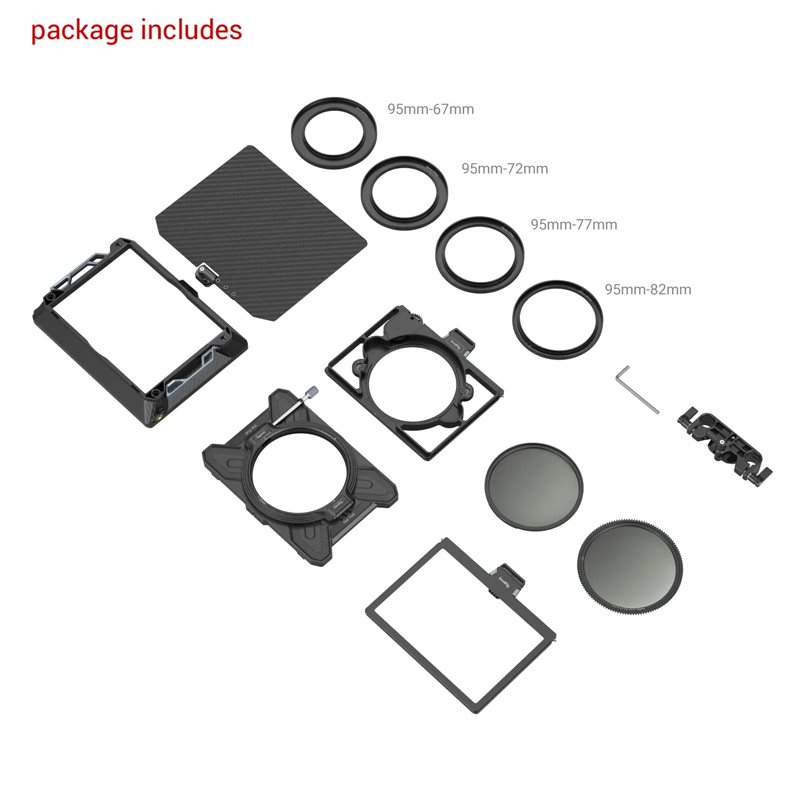 Il matte box è dotato di due stadi portafiltri 4 x 4 e include due vassoi portafiltri 4 x 4. Il piano portafiltri posteriore ruota di 180°, rendendolo adatto per polarizzatori e filtri graduati o a strisce.