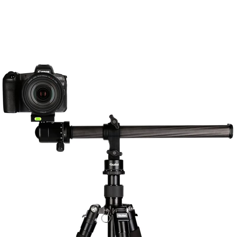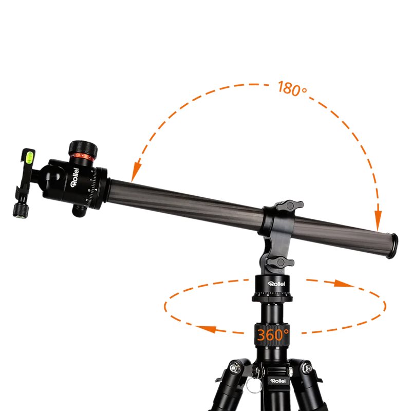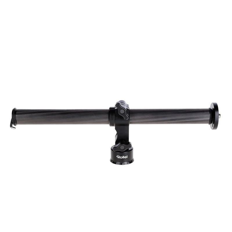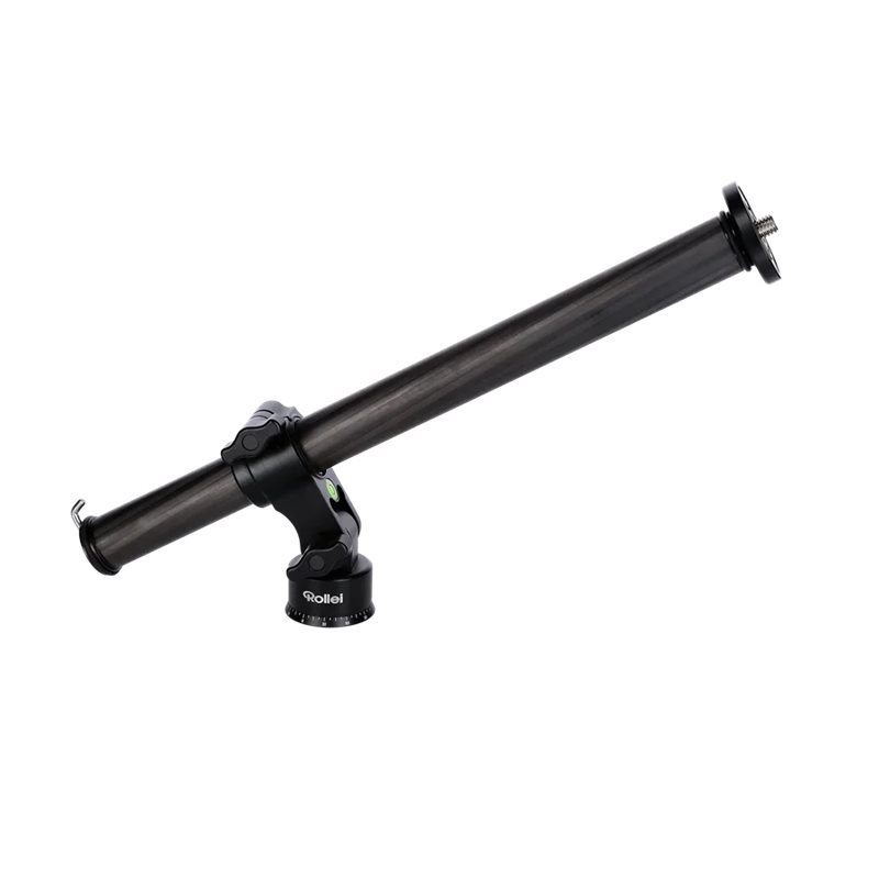 Si puo' montare su qualsiasi treppiedi con vite da 3/8''. Il braccio lungo 60 cm permette di montare due teste perpendicolari a 90.