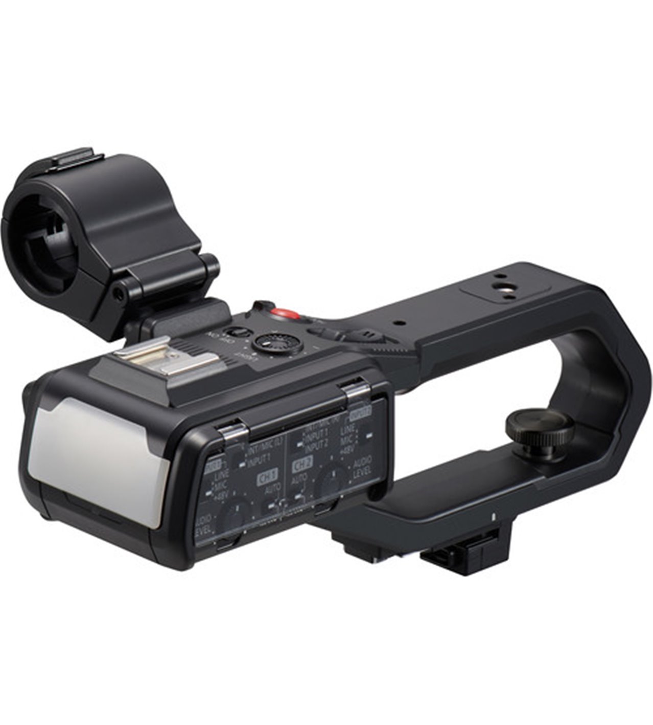 Si monta facilmente sulla parte superiore della videocamera tramite connettore proprietario ed è fissata con una vite a mano. Gli ingressi XLR consentono il controllo del volume e la selezione tra modalità mic/line, con alimentazione phantom +48V, permettendo di registrare audio professionale su due canali.