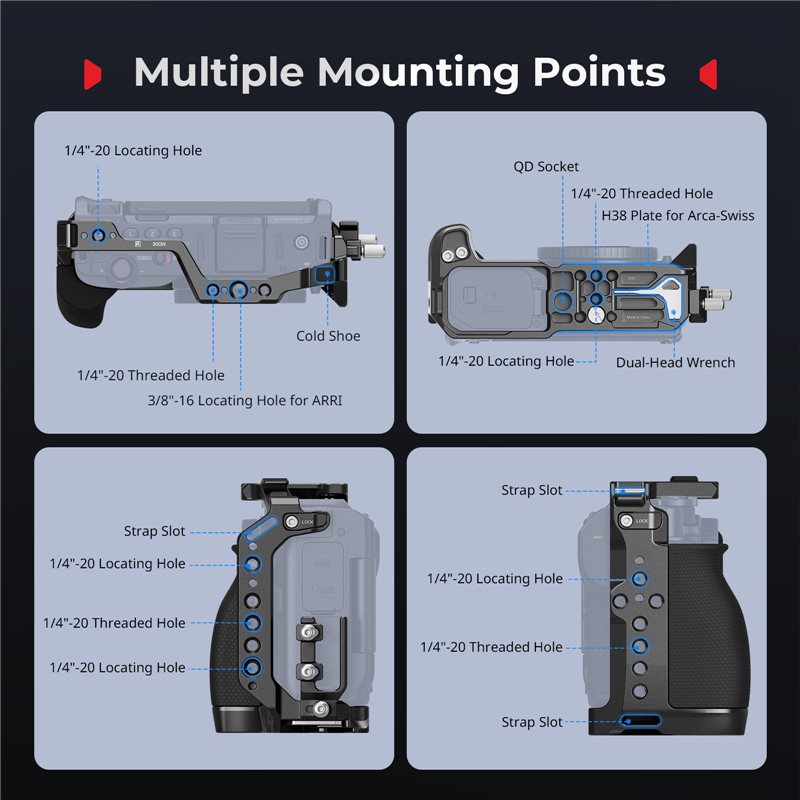 La gabbia è dotata di più fori di posizionamento 1/4 “-20, 3/8” -16 e Arri per il fissaggio degli accessori, che consentono di montare accessori come Cold Shoe 2260, Top Handle 1984 e Monitor Mount 2294. Si integra con un cold shoe slitta per microfono e binario nato a sinistra per Nato Handle 2187 e Magic Arm 2116.